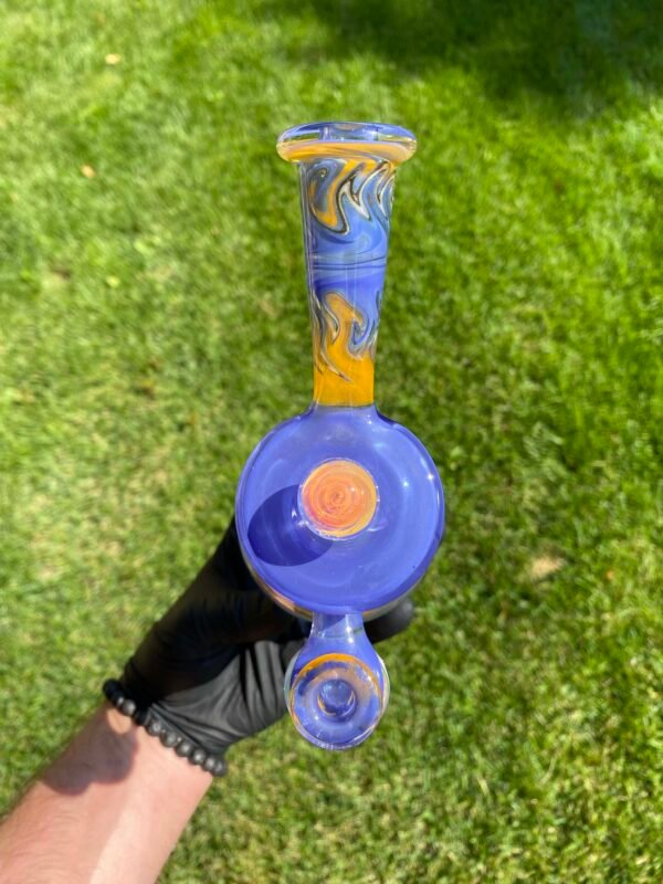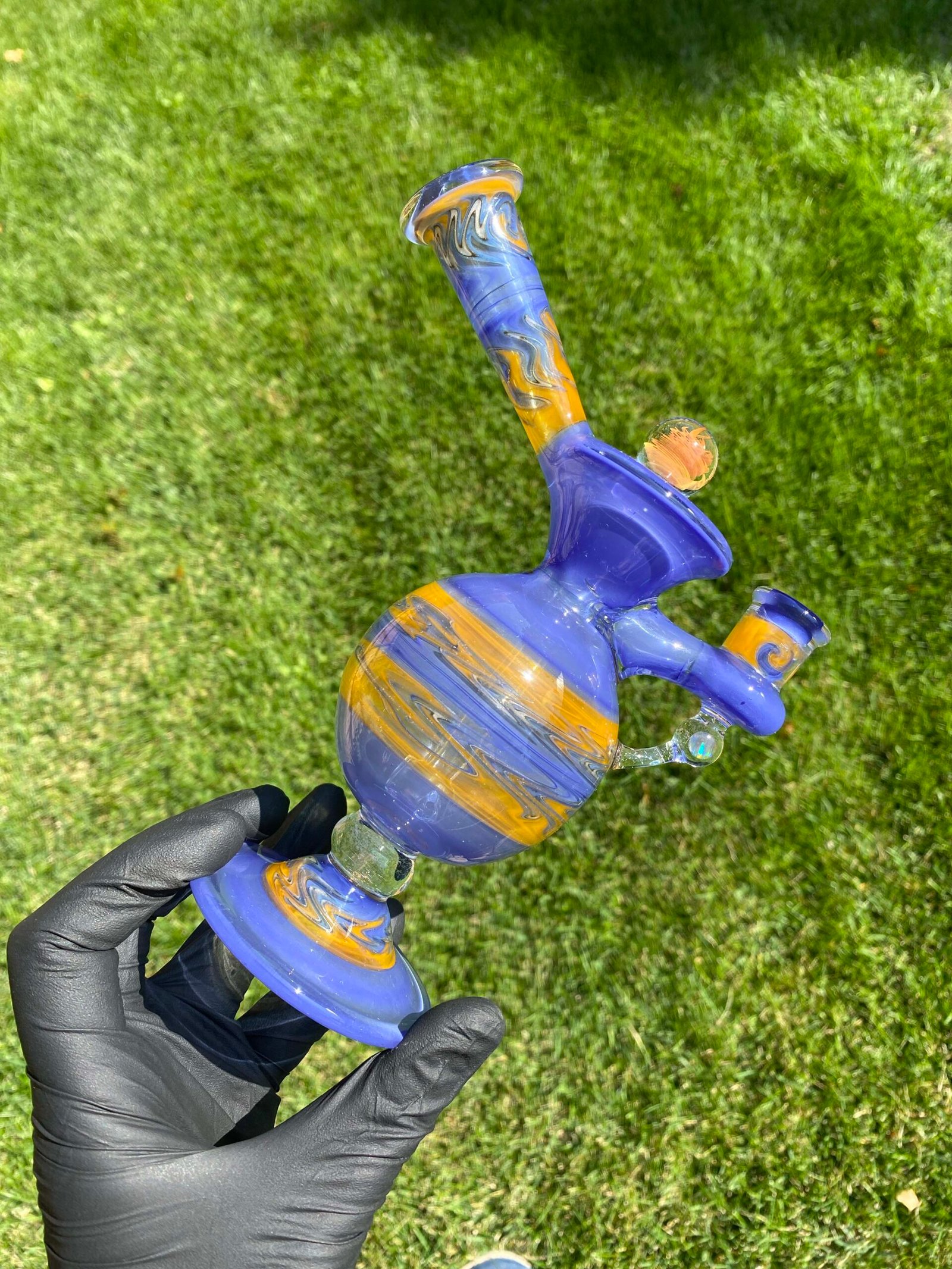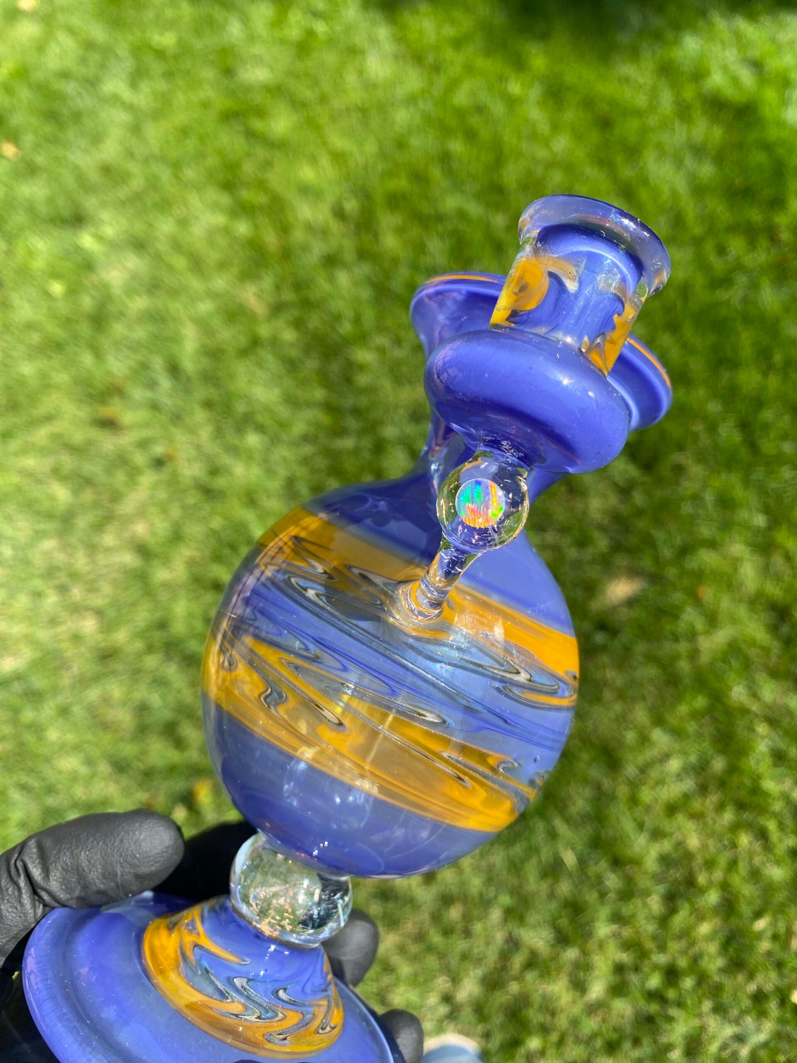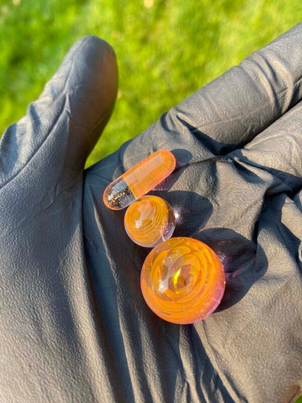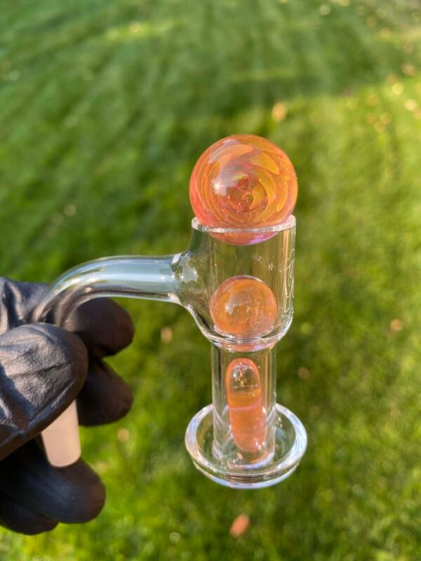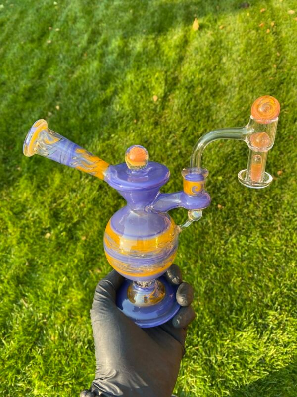 WeredSphere made with hyacinth and tangie rewigs, gold fumed orange dichro accents and a rainbow opal sphere! 90 degree 10mm joint with 3 hole perc. This thing shreds. đ¤ Comes with matching slurper set and campfire quartz nail!