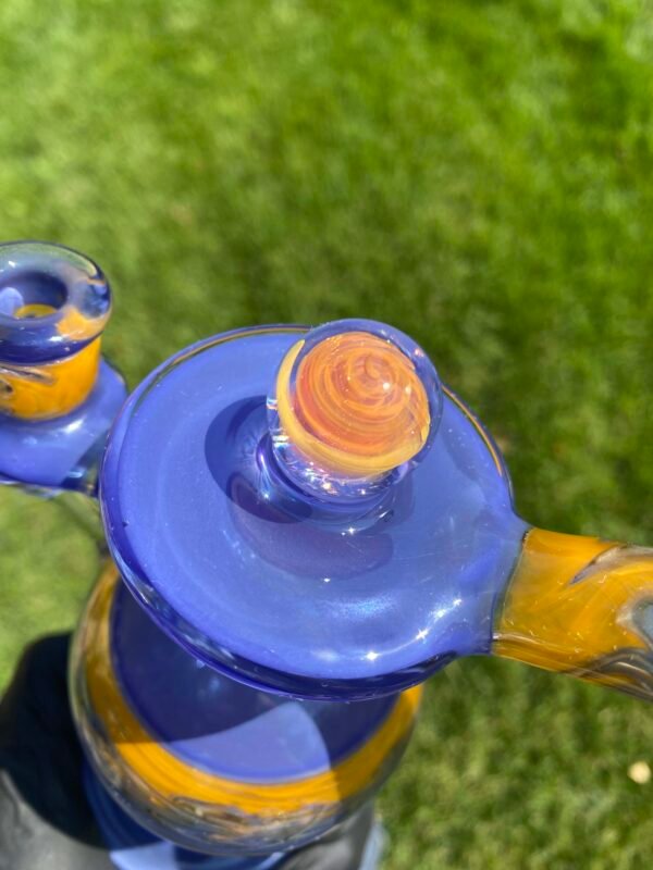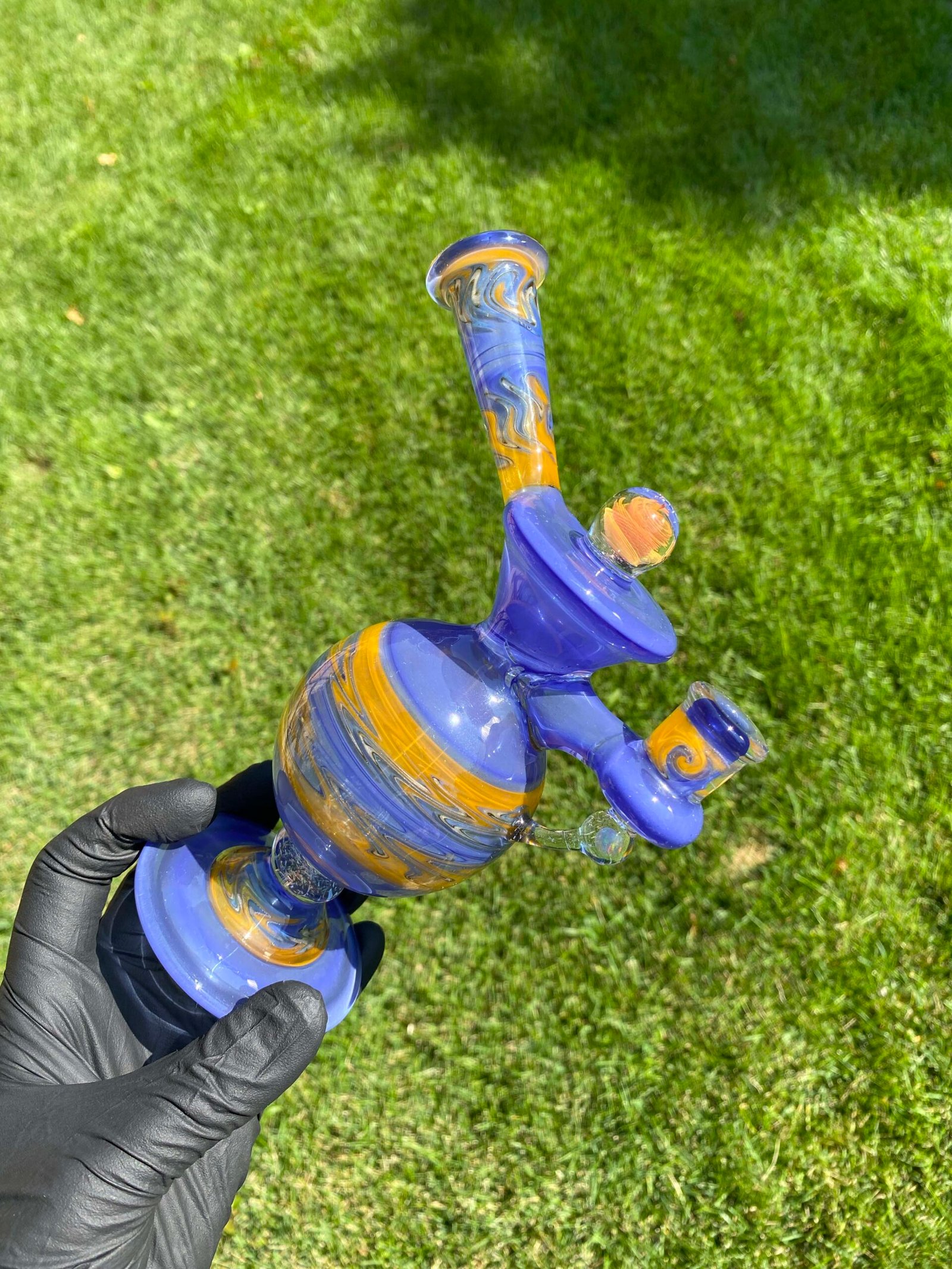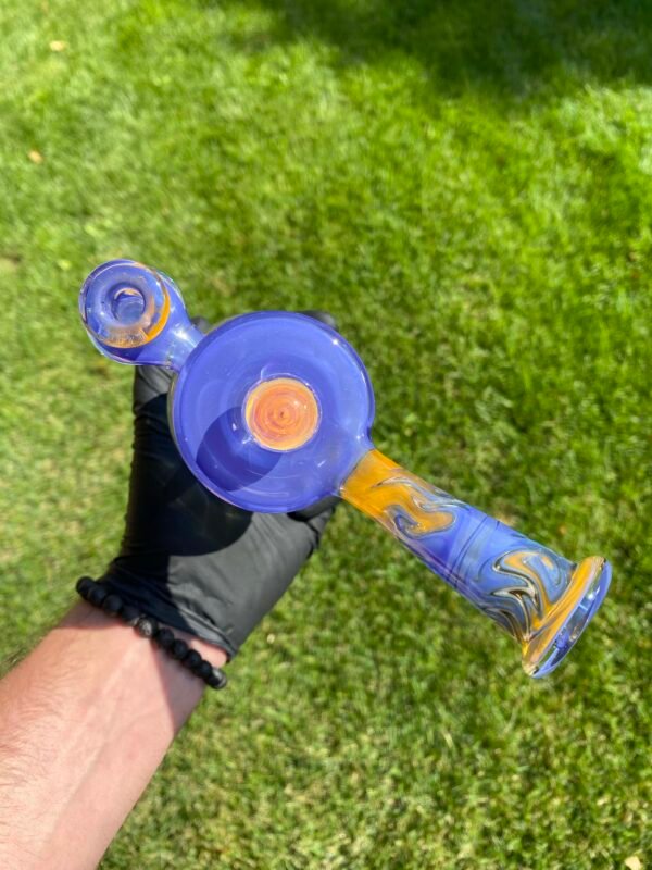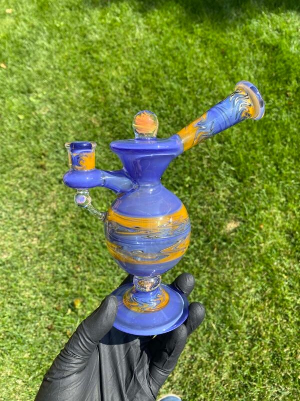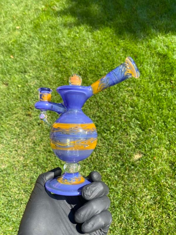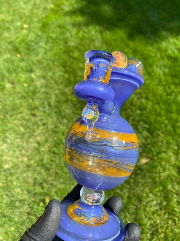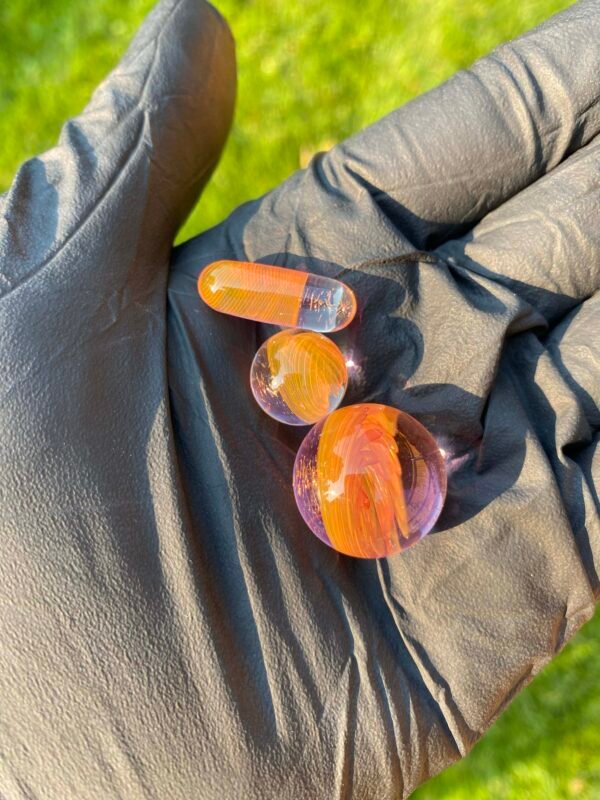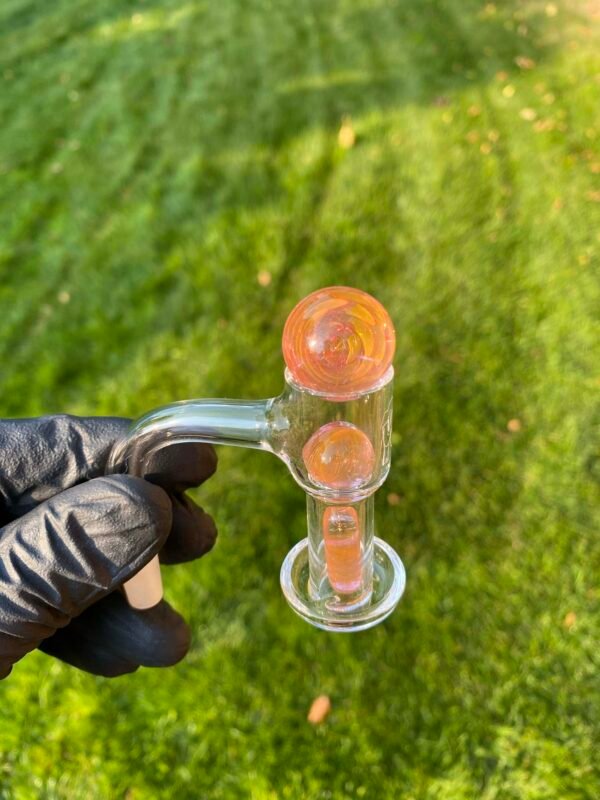 WeredSphere made with hyacinth and tangie rewigs, gold fumed orange dichro accents and a rainbow opal sphere! 90 degree 10mm joint with 3 hole perc. This thing shreds. đ¤ Comes with matching slurper set and campfire quartz nail!